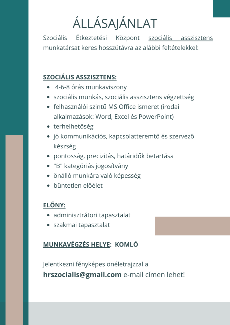 Szociális Étkeztetési Központ szociális asszisztens munkatársat keres hosszútávra az alábbi feltételekkel: SZOCIÁLIS ASSZISZTENS: - 4-6-8 órás munkaviszony - szociális munkás, szociális asszisztens végzettség - felhasználói szintű MS Office ismeret (…